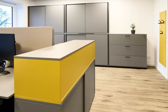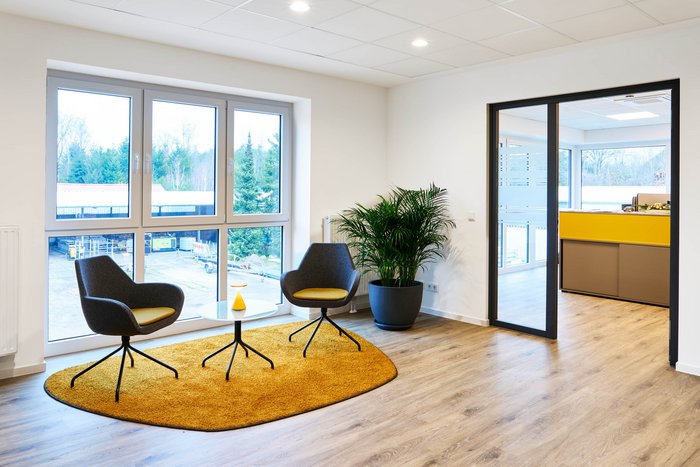 Der Neubau von Bartz Bau in Walsrode überzeugt durch eine offene und lichtdurchflutete Architektur, die durch die moderne Einrichtung von Abenhausen perfekt ergänzt wird. Die Gestaltung verbindet Funktionalität mit Ästhetik und greift die Firmenfarben Anthrazit und Gelb auf, die sich harmonisch in Möbelstücken, Oberflächen, Stoffen und Filzelementen wiederfinden.