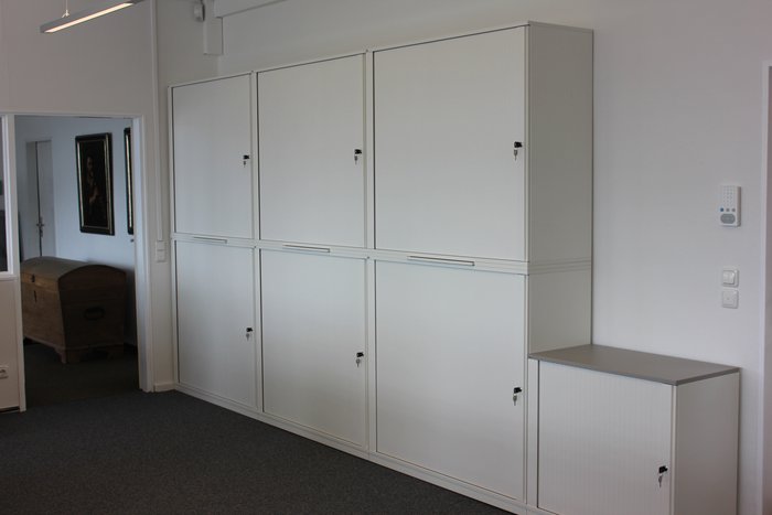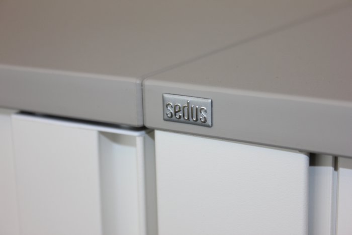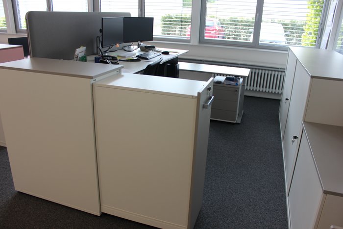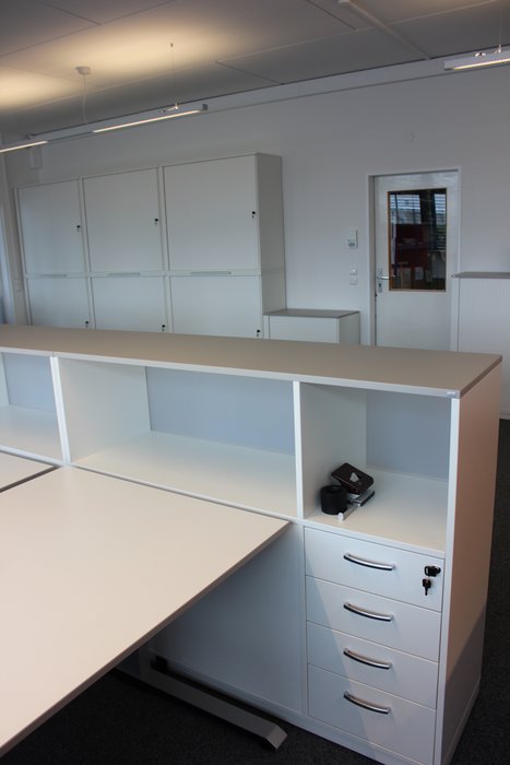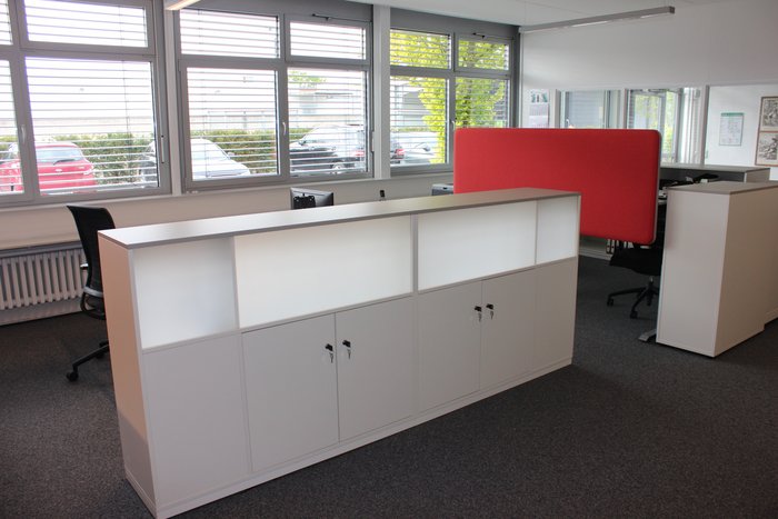 Die Büromöbel vom Hersteller Sedus Systems bringen die ergonomische Note mit und ermöglichen eine praktikable und angenehme Arbeitsweise. Aber auch die Kundenanforderung an viel Staufläche wurde umgesetzt mit bedienfreundlichen„grand slam“ Querrollladenschränken und zusätzlich ausziehbaren Ablageplatten. Ebenfalls funktionell fügen sich die Hochcontainer an den äußeren Arbeitsplätzen ein. Durch die Möglichkeit des Auszugs und der somit seitlichen Nutzung vom Arbeitsplatz aus schaffen diese Container nicht nur die perfekte Organisation,sondern bilden gleichzeitig eine Art Tresen als Anlaufstelle für Kollegen. Des Weiteren sind diese Arbeitsplätze mit elektromotorisch höhenverstellbaren „temptation c“ Schreibtischen, Rollcontainern und „se:wall“ Akustikwänden bestückt, die sich farblich im Corporate Design einfügen.Außerdem wurden Monitorarme des Herstellers „Schneider Novus“ montiert, um mehr Platz auf dem Tisch zu gewinnen. Das Modell „LiftTEC“ verfügt über eine Gasdruckfeder mit sehr flexibler und werkzeugloser Verstellung. Am mittleren Doppelarbeitsplatz steht das „grand slam z“ Schranksystem mit transluzenter Rückwand und seitlich bedienbaren Schubladen als Blickfang.Abschließend wurden zwei neue Drucker platziert, die durch ihre hohe Druckgeschwindigkeit die einzelnen Arbeitsabläufe noch optimieren.