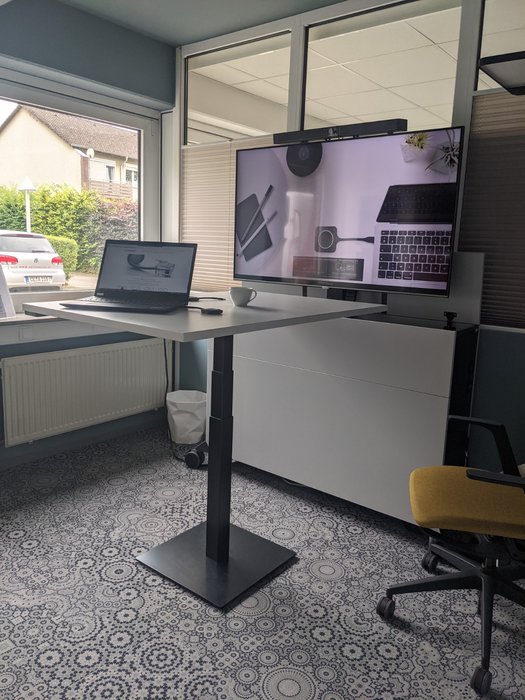 - Tisch mit Gasfeder-Höhenverstellung für Konferenz im Sitzen oder Stehen!